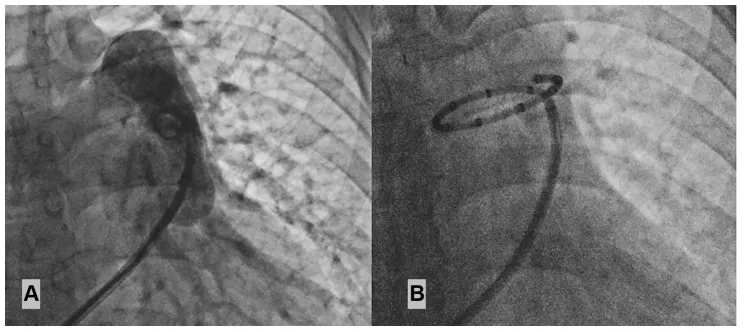 图1:(A)肺动脉造影,(B)肺动脉去神经射频消融