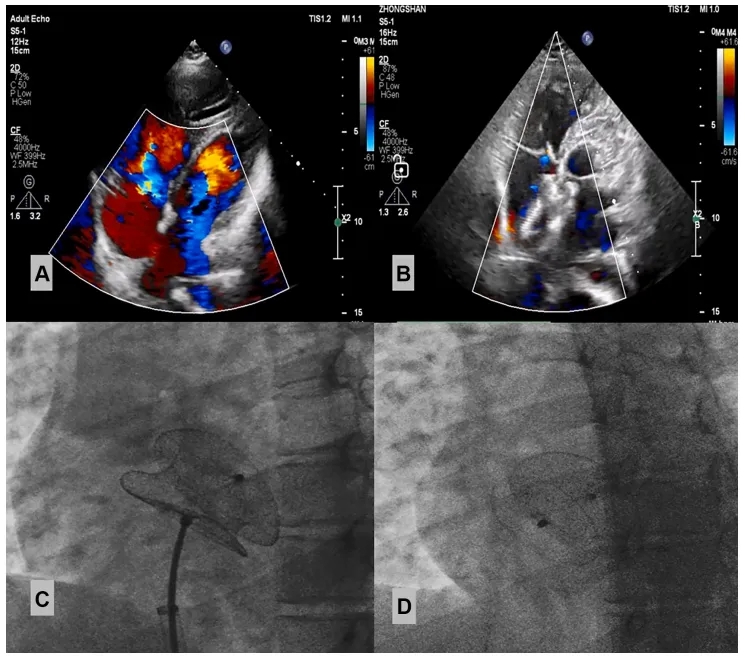 (A)术前超声心动图显示ASD,(B)封堵完成后超声心动图,(C)术中封堵,(D)释放封堵器后。