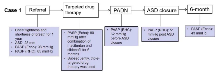 以上两例病例均为ASD合并重度PAH患者,均采用PAH靶向药物联合PADN和经皮ASD封堵术的序贯疗法。患者在接受了三联靶向药物治疗后进行PADN治疗,以达到符合经皮ASD封堵术的血流动力学标准。