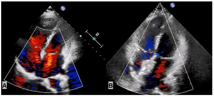 (A)术前超声心动图显示ASD,(B)封堵完成后超声心动图。
