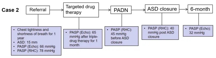 从这两例病例可以看出,PADN可有效改善血流动力学指标(肺动脉压及PVR),最终使患者能够满足接受经皮ASD封堵术的条件。这也是首次针对诊断“灰色地带”中ASD合并重度PAH患者实施“序贯治疗”策略的实例。