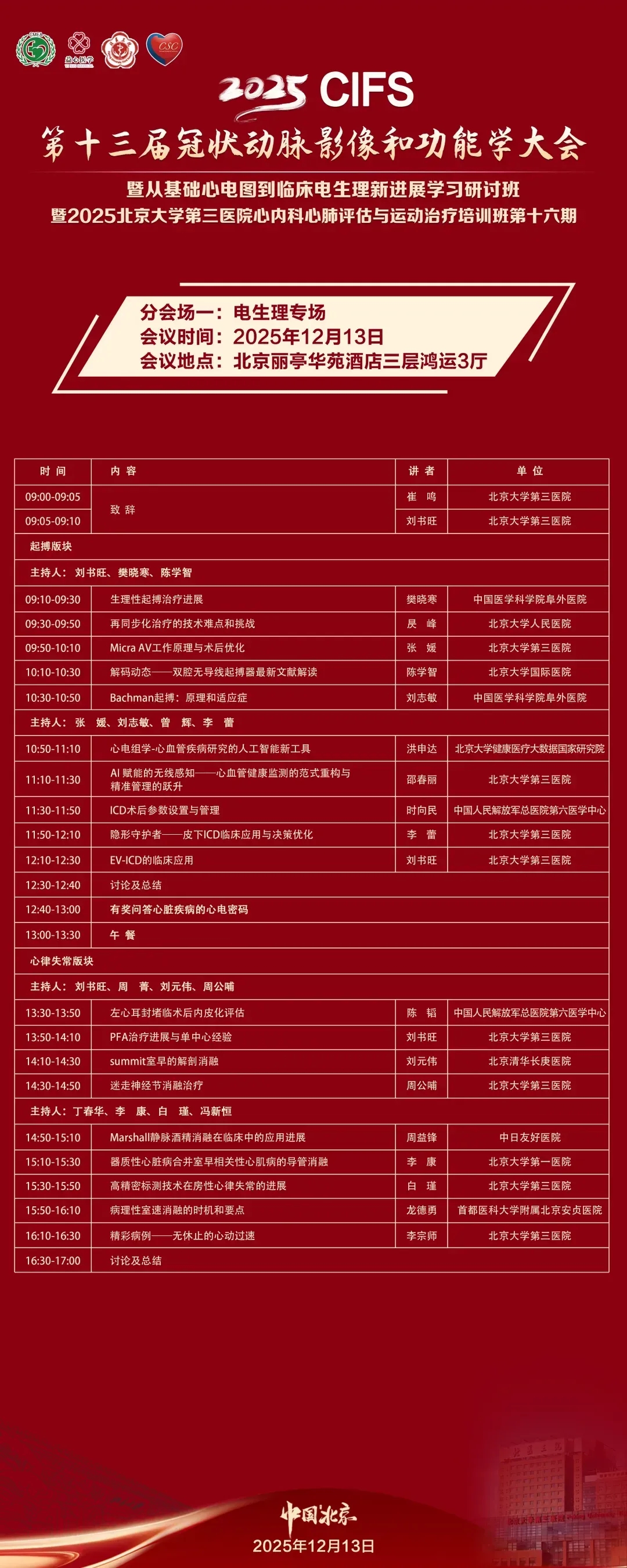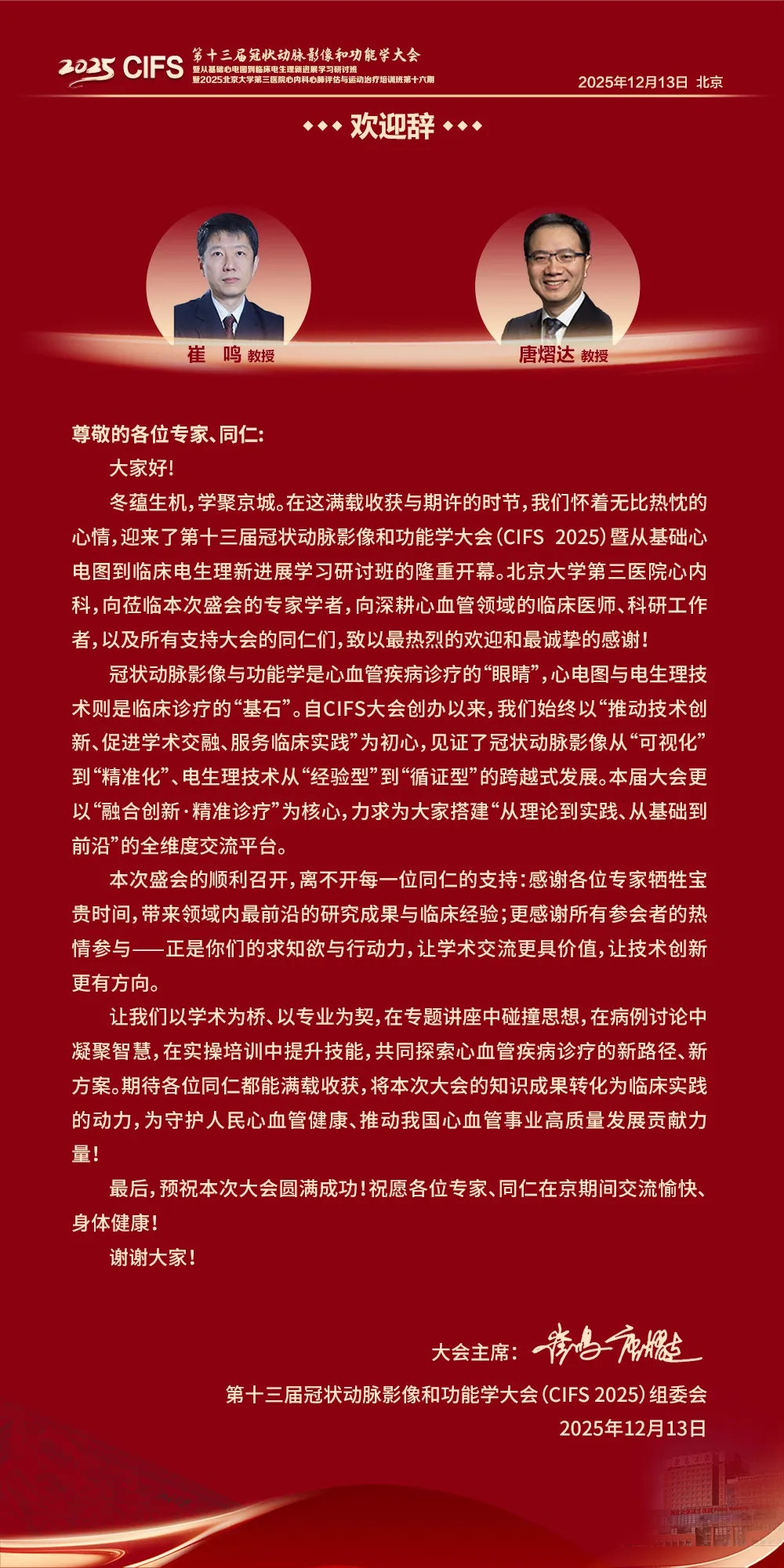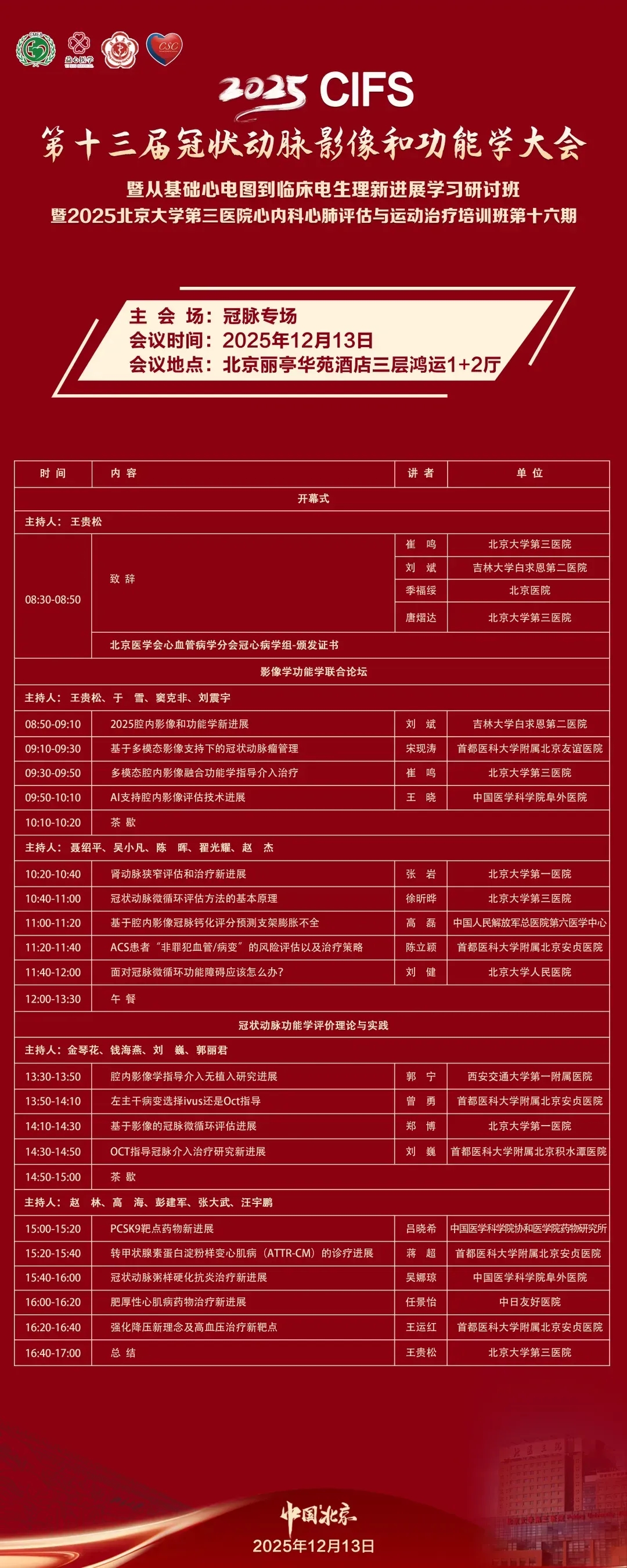 为进一步促进冠脉影像和功能学、心电图与电生理等技术在临床中的高质量发展与精准应用,由中国医药教育协会、中关村益心医学工程研究院主办,北京大学第三医院、中华医学会心血管病学分会冠脉腔内影像及生理学学组、北京大学医学部心血管内科学系、海淀区心血管内科质量控制和改进中心、北京医学会心血管病学分会冠心病学组协办的“第十三届冠状动脉影像和功能学大会(CIFS 2025)暨从基础心电图到临床电生理新进展学习研讨班暨2025北京大学第三医院心内科心肺评估与运动治疗培训班第十六期”会议将于12月13日以线上线下结合形式在京隆重启幕。