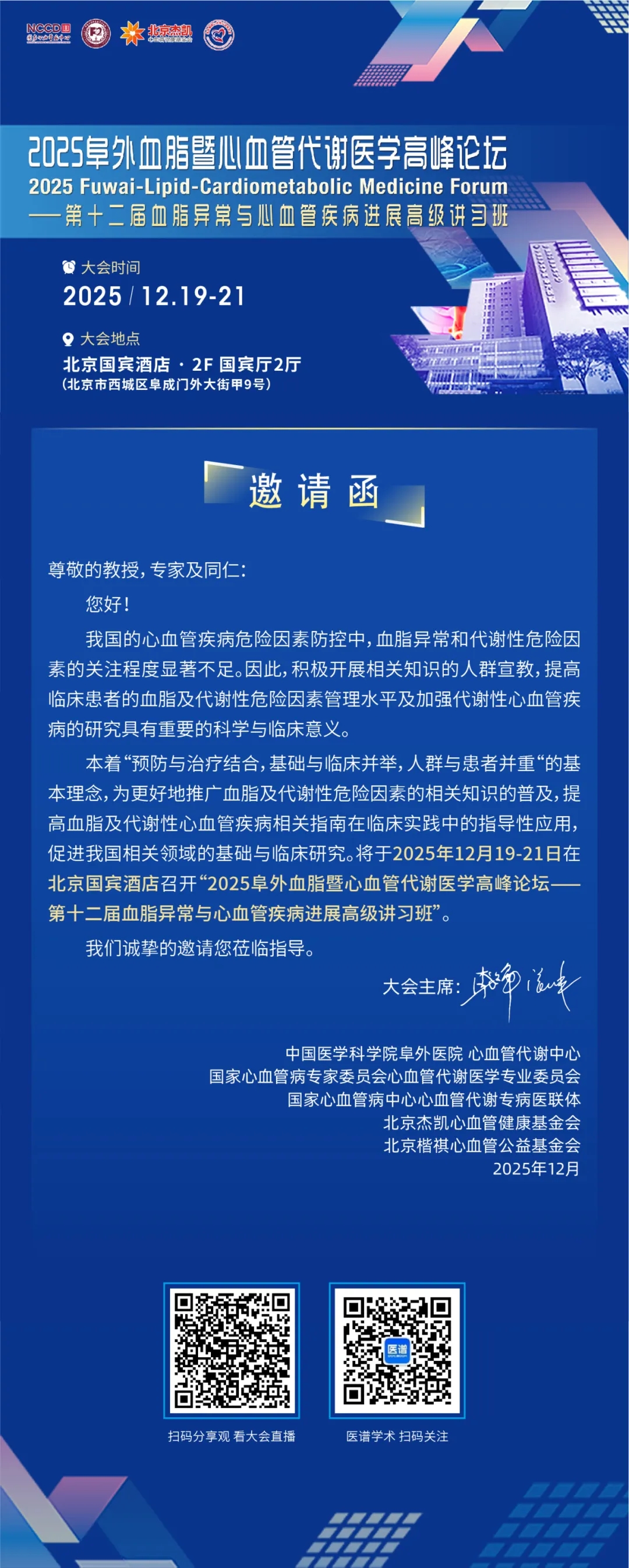 2025年12月19日-21日,由中国医学科学院阜外医院 心血管代谢中心,国家心血管病专家委员会心血管代谢医学专业委员会,国家心血管病中心心血管代谢专病医联体,北京杰凯心血管健康基金会,北京楷祺心血管公益基金会联合举办的“2025阜外血脂暨心血管代谢医学高峰论坛——第十二届血脂异常与心血管疾病进展高级讲习班”即将于北京国宾酒店召开。