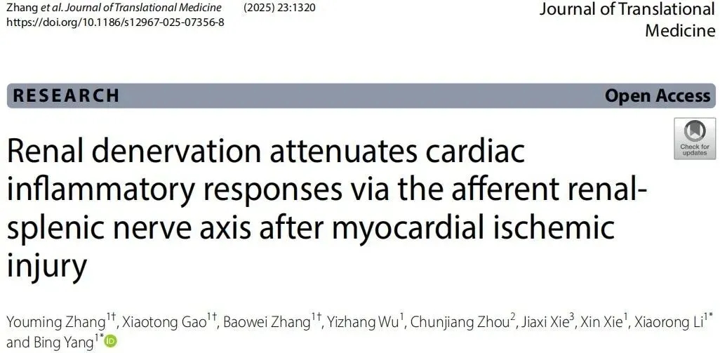 2025年11月19日,同济大学附属东方医院杨兵教授团队在Journal of Translational Medicine上发表题为“Renal denervation attenuates cardiac inflammatory responses via the afferent renal-splenic nerve axis after myocardial ischemic injury”的研究论文。该研究系统揭示了RDN通过“肾传入神经—脾神经轴”减轻心肌缺血后心脏炎症反应的神经环路及分子机制,并进一步探讨了以外周神经轴为靶点干预心肌缺血后不良心室重构的新策略,为该类疾病的防治提供了新思路。