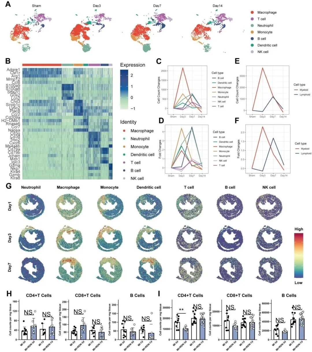 该研究首先在心梗(MI)小鼠中评估了RDN对MI后心功能及炎症反应的影响。结果表明,RDN可显著改善MI后小鼠心功能、减小梗死心肌面积、降低心脏纤维化比例、并增加梗死区心室壁厚度。通过分析不同时间节点心梗小鼠心脏的单细胞转录组(scRNA-seq)和空间转录组数据,并结合流式细胞术发现,RDN主要影响小鼠心脏髓系细胞浸润,对淋系细胞无明显影响。