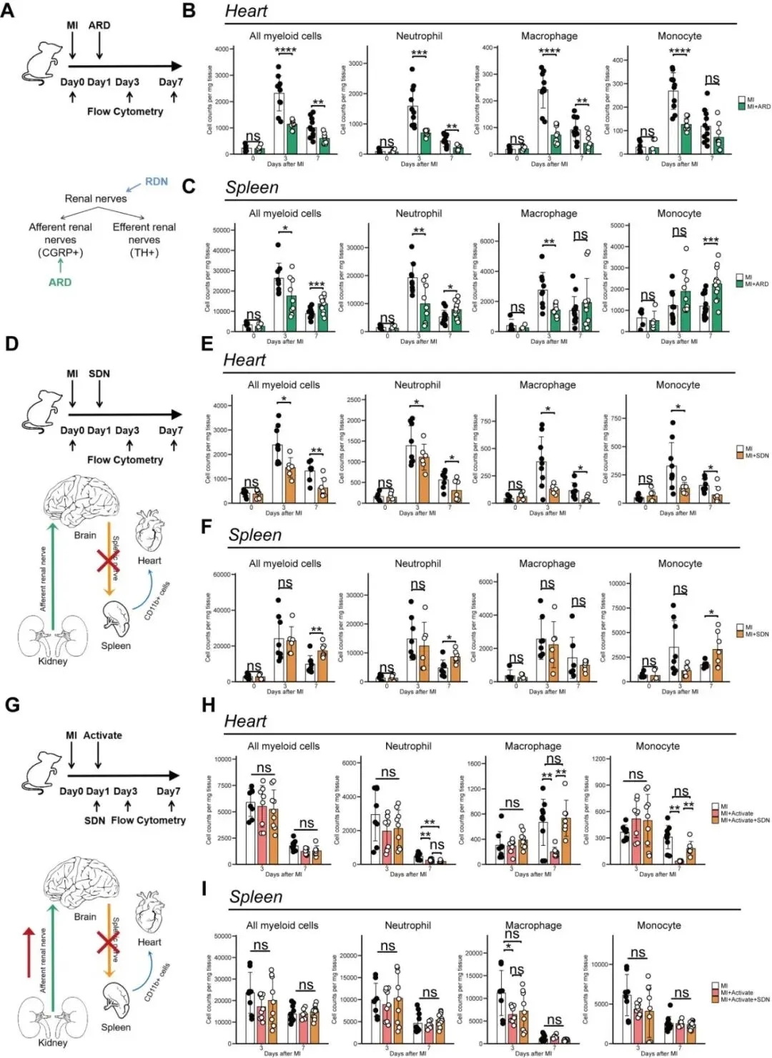 鉴于心梗后梗死区聚集的髓系细胞主要来源于骨髓的造血干细胞以及脾等髓外器官,研究进一步分析了心梗小鼠外周血、骨髓及脾脏中髓系细胞及其亚群的变化。结果发现,RDN显著降低MI后7天血液中的髓系细胞数量,与心脏中髓系细胞的变化一致。但却增加了骨髓和脾脏中的髓系细胞数量。对髓系细胞亚群的深入分析显示,巨噬细胞、中性粒细胞和单核细胞的变化模式与总髓系细胞相似,提示RDN并非单独影响某一亚型,而是整体调控髓系细胞群体。研究进一步通过特异性化学消融手段,分段消融不同节段神经,发现调控肾神经活性主要通过“肾传入神经—脾神经轴”改善MI后心脏炎症,其机制涉及对脾脏髓系细胞迁移的调控。