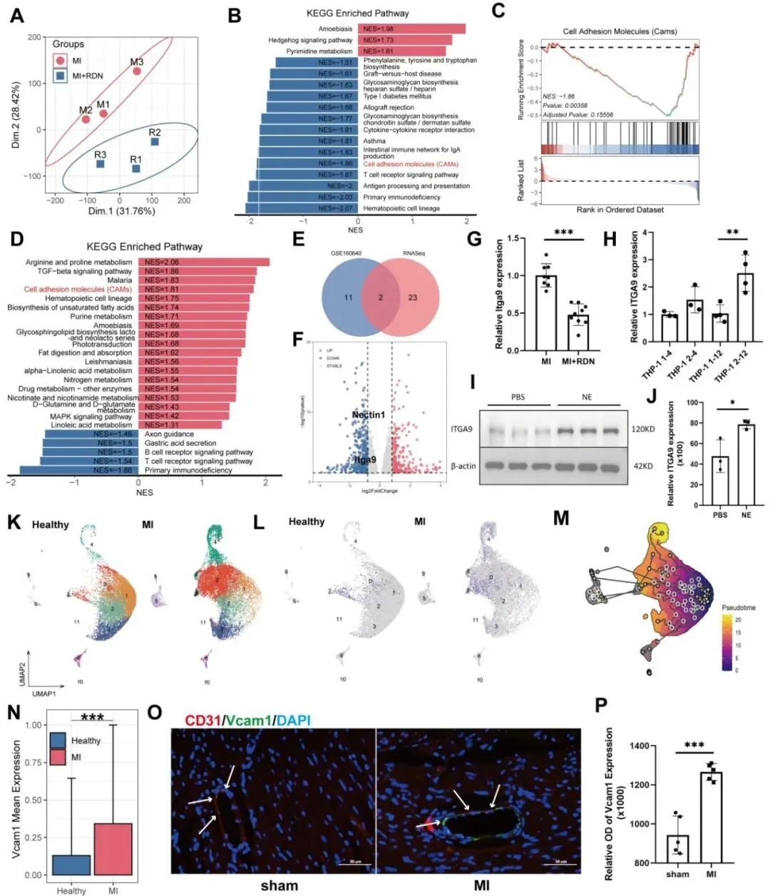 为深入解析肾传入神经—脾神经轴调控脾髓系细胞迁移的分子机制,团队采用特异性神经激活结合分段神经消融的方法,证实对肾神经的调控可通过该神经轴将信号传递至脾脏,改变脾脏内去甲肾上腺素(NE)的浓度。进一步分选脾脏CD11b+细胞进行Bulk RNA-seq测序发现,RDN显著下调了与细胞黏附分子(CAMs)相关基因的表达。将其与β2肾上腺素能受体(β2AR)激活的骨髓来源巨噬细胞(BMDM)转录组数据对比,发现RDN下调CAMs的机制由NE-β2AR通路介导,进一步交叉分析发现,ITGA9是其中的关键分子。体外细胞实验证实,NE刺激能以浓度和时间依赖的方式提高THP-1细胞中ITGA9的表达,并增强其迁移能力。分析小鼠MI后心脏内皮细胞数据发现MI后心脏内皮细胞高表达ITGA9的配体VCAM-1,免疫荧光的结果证实了这一点。