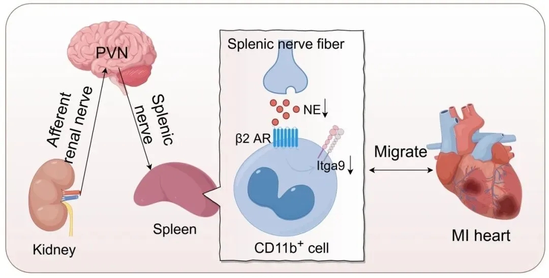 综上,本研究多项创新成果具有重要科学价值和转化意义:1) 系统阐明了RDN通过“肾传入神经—脾神经轴”调控脾脏CD11b+髓系细胞迁移,从而改善MI后心脏炎症的神经环路机制,为理解肾脏—心脏—脾脏轴在心血管疾病中的作用提供了新视角;2) 揭示了该神经轴通过调节脾脏内NE水平影响CD11b+髓系细胞迁移的具体机制,并证实该过程由交感神经介导,为神经—免疫交互研究提供了新依据;3) 明确了NE通过调控CD11b+髓系细胞表面ITGA9的表达,影响其与内皮细胞VCAM-1的结合,进而调控细胞迁移的分子通路,为靶向ITGA9–VCAM-1相互作用治疗炎症性疾病提供了新思路。