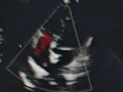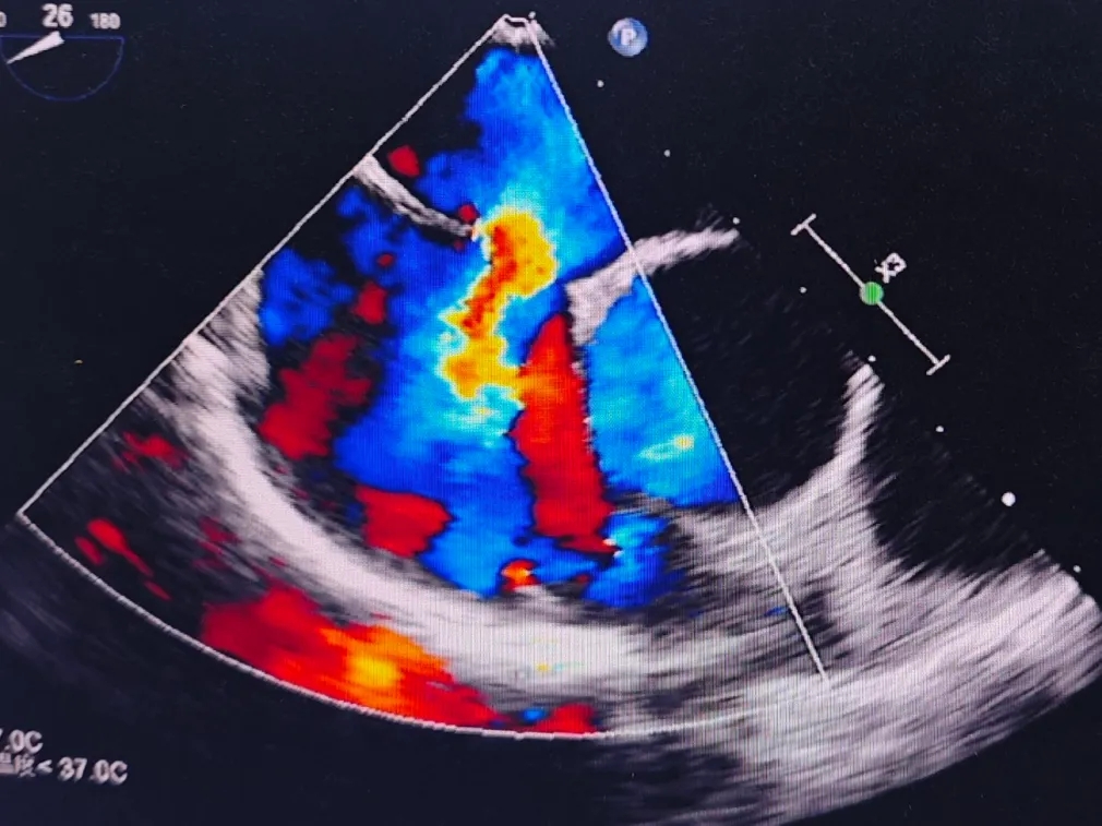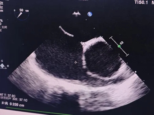 经食道超声描述:房间隔总长42mm,房间隔中部可见回声脱失约15mm,缺损距二尖瓣环约17mm,距离上腔静脉约9mm,主动脉侧残端约3mm。CDFI: 房水平见左向右分流信号。