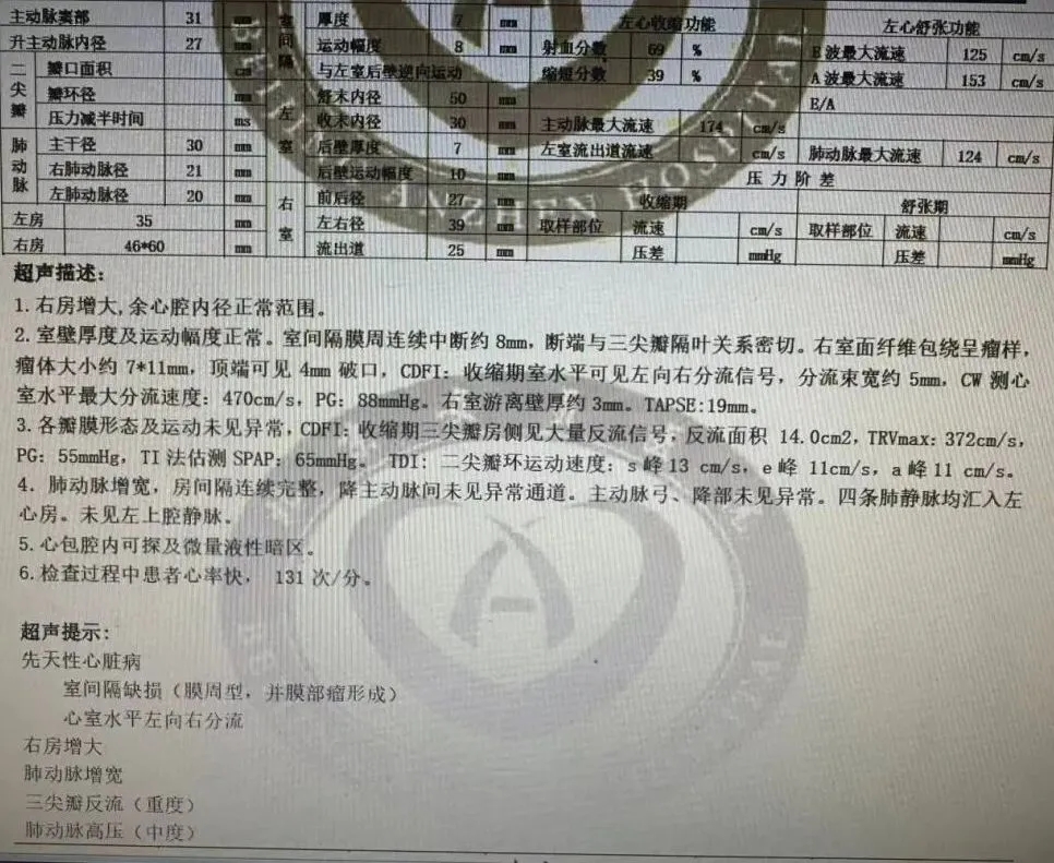 超声心动图:提示室间隔缺损,膜周部,LVED 50mm