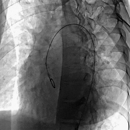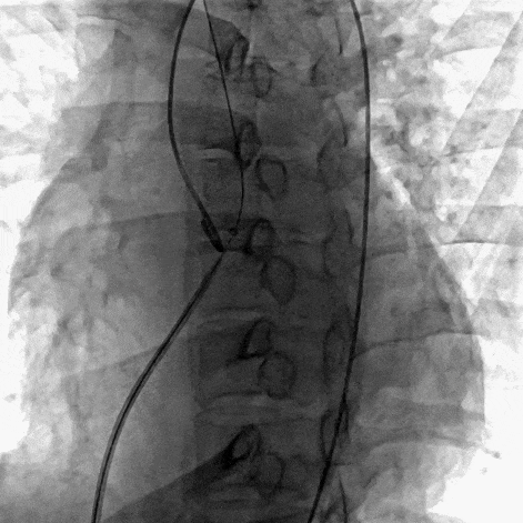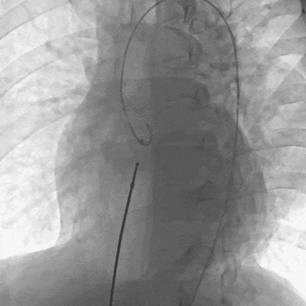 术前主动脉根部造影示:主动脉窦瘤破裂(无窦-右心房),大量左向右分流