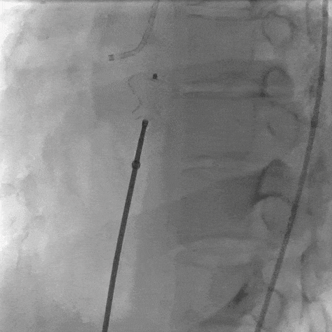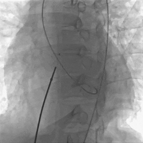 患者局麻后穿刺右股动脉及股静脉,经股动脉送入猪尾导管分别行左心室造影+主动脉根部行根部造影提示主动脉窦瘤破裂(无冠窦-右心房),持续大量左向右分流。明确病变位置后建立股动静脉轨道,经右侧股静脉送入输送鞘并送入先健12/14mm PDA封堵器。再次造影无分流,超声提示窦瘤破裂封堵完好,基本无残余分流,主动脉瓣未受影响。