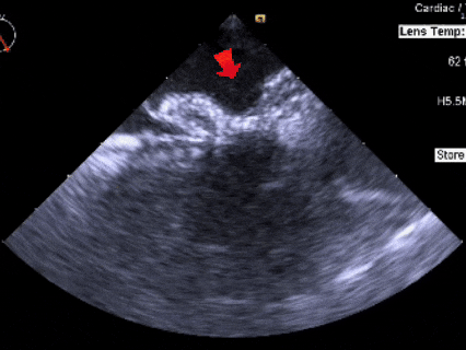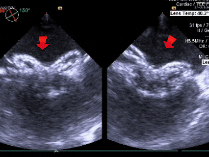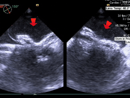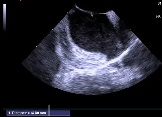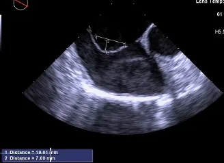 经食道超声所见:房间隔总长度约41mm。房间隔中部局部呈瘤样向右房膨出范围约11×19mm,房间隔中部回声中断约11×9mm,缺损上缘距房顶约17mm,缺损下缘距二尖瓣约10mm,缺损后下缘距下腔静脉约21mm,缺损后上缘距上腔静脉约13mm,短轴切面前残端0mm,后残端24mm。