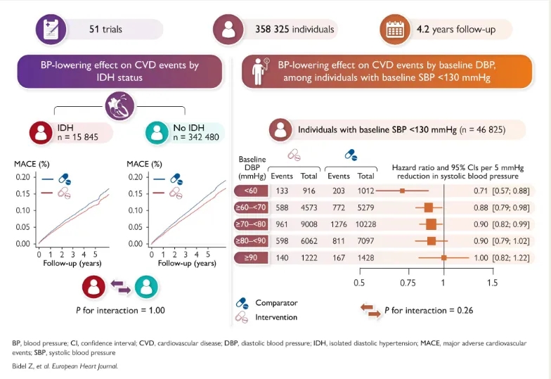 在这一迄今规模最大的随机化降压药物治疗证据中,我们发现:单纯舒张期高血压(IDH)患者从降压治疗中获得的心血管获益,与非 IDH 人群基本一致。与无 IDH 人群相比,IDH 患者在全因死亡风险方面,并未显示出治疗效果更差或更好的证据。