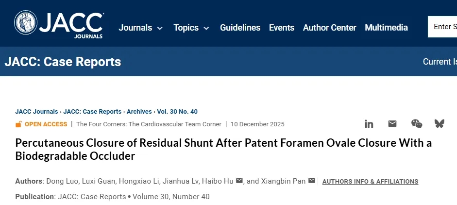 近期,全球心血管领域顶级期刊《美国心脏病学会杂志》(JACC)子刊 JACC: Case Reports 发表了一例中国原创创新器械的临床应用案例。该病例由中国科学院阜外医院结构性心脏病团队发表,首次报道应用可降解卵圆孔未闭(PFO)封堵器,成功为一名传统金属封堵器术后出现残余右向左分流、并导致头痛和卒中复发的患者实施了二次干预治疗。这一创新实践为PFO术后残余分流的临床管理路径提供了新的循证医学证据。