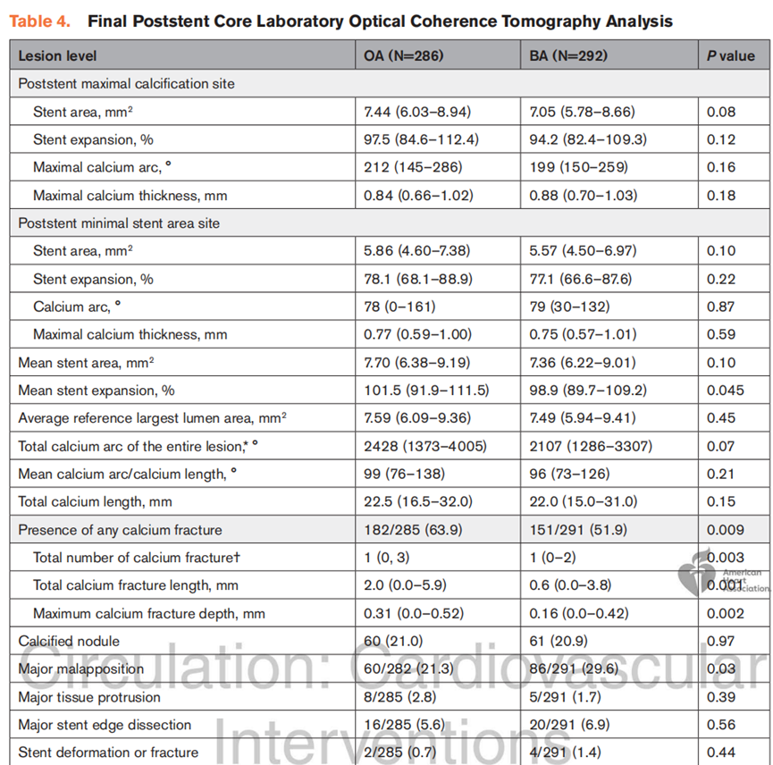 在整个OCT子研究队列中,术后即刻测得的最大钙化弧、最大钙化厚度及钙化总长度分别为204°(四分位距149°–268°)、0.85 mm(0.69–1.03 mm)和22.0 mm(16.0–31.0 mm),两组间差异均无统计学意义。最大钙化部位的OCT定义最小支架面积(MSA)普遍较大,OA组与BA组差异不显著:OA组中位数 7.44 mm²(6.03–8.94 mm²),BA组中位数 7.05 mm²(5.78–8.66 mm²),P = 0.08。全支架段的MSA同样无显著差异:OA组 5.86 mm²(4.60–7.38 mm²),BA组 5.57 mm²(4.50–6.97 mm²),P = 0.10。支架背侧的钙化断裂在OA组显著多于BA组,且OA组的钙化断裂数量、总长度及最大深度均更大。主要贴壁不良(major malapposition)发生率BA组高于OA组:BA组 29.6 %,OA组 21.3 %,P = 0.03。主要夹层(major dissection)和组织突出(tissue protrusion)发生率两组间无差异。