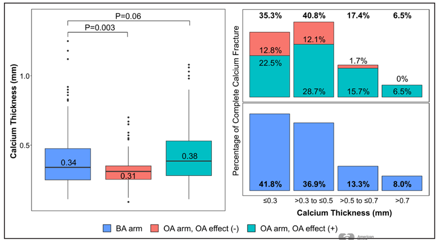 其次,研究进一步比较了OA与BA对钙化修饰的影响,共纳入414处OA组和263处BA组的钙化斑块,均具备完整钙化断裂数据,结果显示:OA组中,304处(73.4%)钙化斑块在断裂处可见“OA效应”,尤其在钙化厚度>0.5 mm的病变中更为常见。有“OA效应”的OA组病变,其钙化断裂厚度更大(中位数0.38 mm [0.28–0.53 mm];P=0.06);无“OA效应”者断裂厚度较小(0.31 mm [0.25–0.35 mm],P=0.003);BA组钙化断裂厚度为0.34 mm [0.25–0.48 mm],介于上述两者之间。