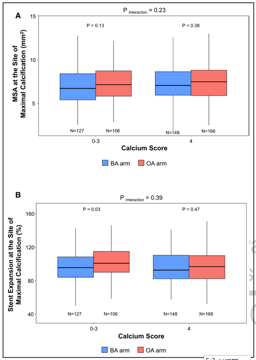 尽管OA在钙化修饰方面表现出更显著的断裂效应,但在钙化评分分层(0–3分 vs 4分)中,OA与BA对最大钙化部位的MSA(P交互=0.23)或支架膨胀率(P交互=0.39)均未见显著交互作用。