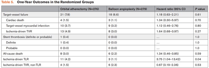 在该研究中,随机接受OA与BA治疗后的1年靶血管失败(TVF)发生率相似:OA组 7.8%,BA组 6.6%,P = 0.61。除缺血驱动的靶病变血运重建(ID-TLR)外,两组在其他次要临床终点事件发生率上均无显著差异:ID-TLR发生率:OA组 4.2%,BA组 1.1%,P = 0.04。
