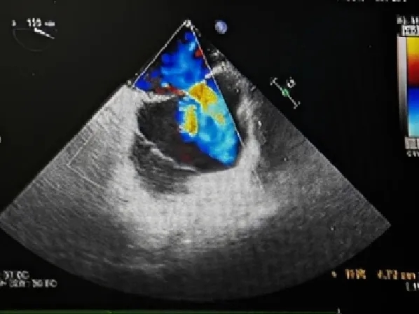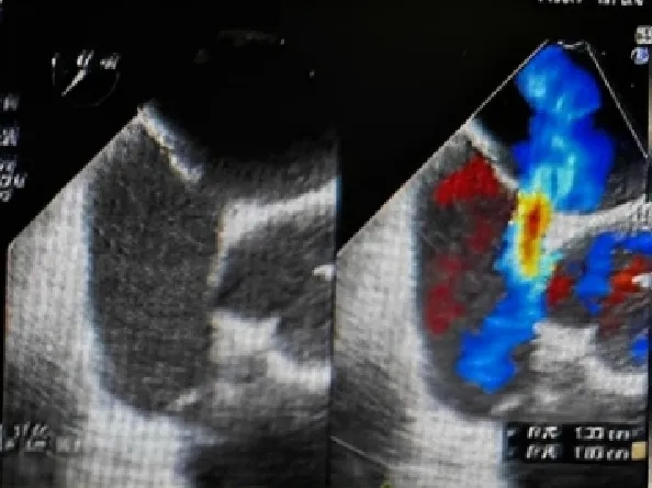 经食道超声描述:四腔心切面观:房间隔总长约48mm,中部卵圆窝处菲薄。房间隔中部回声中断约12.6mm,残端距二尖瓣环约23mm(软缘,房间隔中部菲薄),距房顶部约13mm(硬缘)。双腔切面观:房间隔中部回声中断约14.6mm,残端距上腔静脉约15.8mm(硬缘),距下腔静脉约23.8mm(硬缘)。大动脉短轴切面观:房间隔回声中断约12mm,主动脉侧几乎无残端,距心房侧约18mm(硬缘)。CDFI: 房水平可见左向右分流血流信号。三尖瓣口见少量反流血流信号。