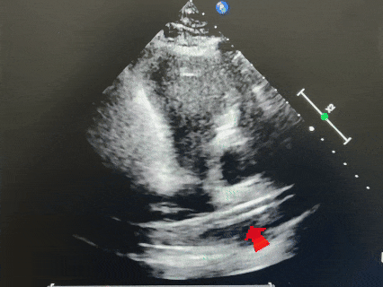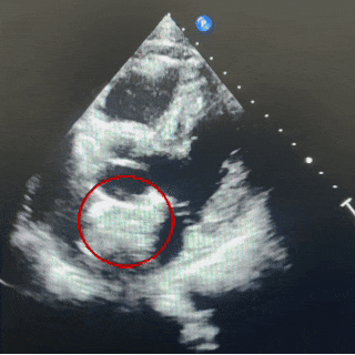 再将输送系统整体后撤贴靠房间隔,超声下可见左盘贴合在房间隔上