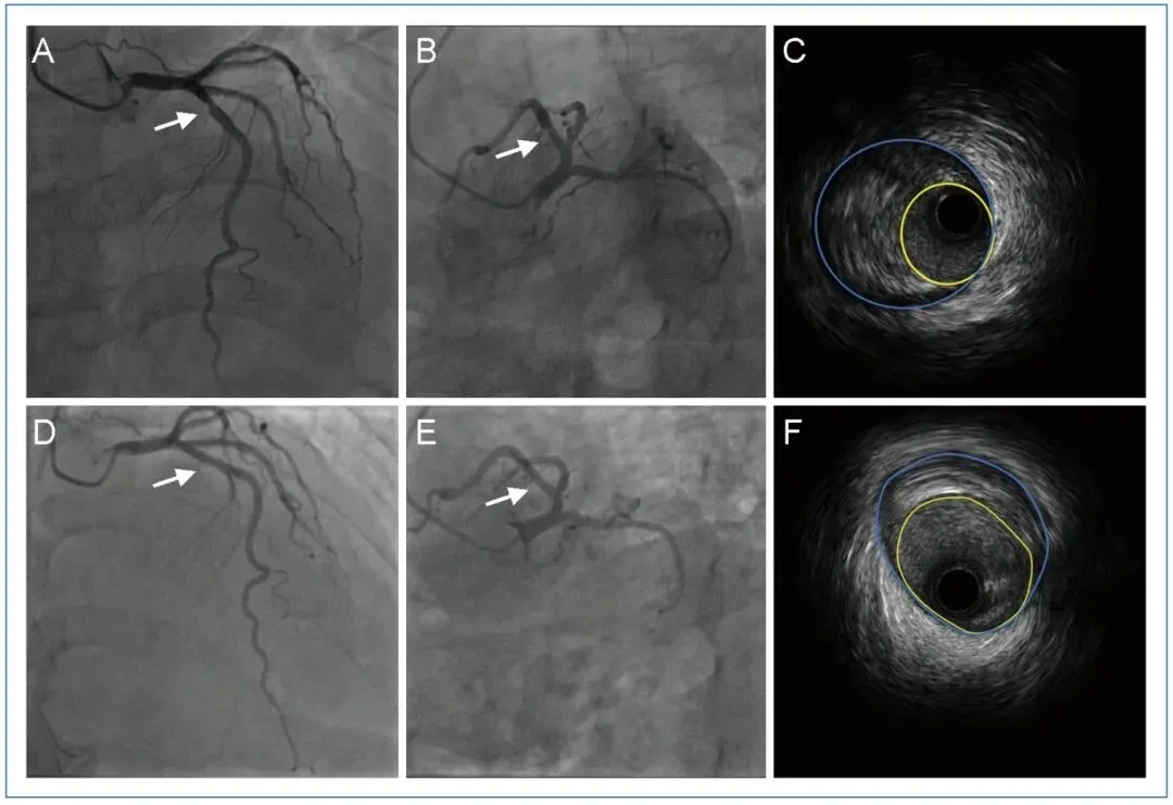 图1. 患者的冠脉造影和血管内超声显示冠状动脉斑块消退