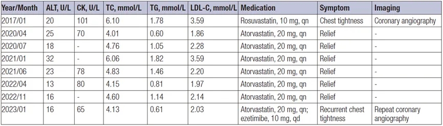 2020 年,瑞舒伐他汀调整为阿托伐他汀 20 mg/晚。此后每年两次随访,LDL-C 水平维持在 1.86-3.59 mmol/L(表1)。患者长期居住于岛屿地区,保持以海鲜为主的饮食模式,且该饮食习惯多年未变。