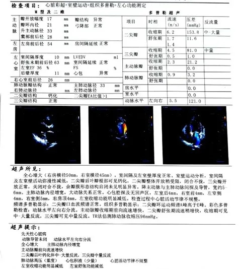 心脏超声:先天性心脏病,动脉导管未闭。动脉水平左向右分流。全心增大。主肺动脉内径增宽,主动脉瓣前向流速增快。二尖瓣后叶钙化伴中-大量反流,三尖瓣中量反流。肺动脉高压(重度)。心包积液(少量)。心脏活动节律不规整。左室收缩功能明显减低,左室舒张功能减低。