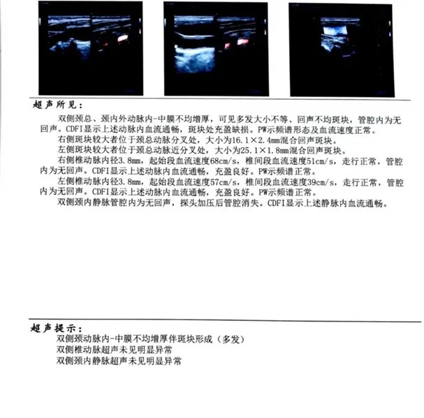 颈部血管彩超:双侧颈动脉内-中膜不均增厚伴斑块形成(多发);双侧椎动脉超声未见明显异常;双侧颈内静脉超声未见明显异常。