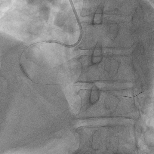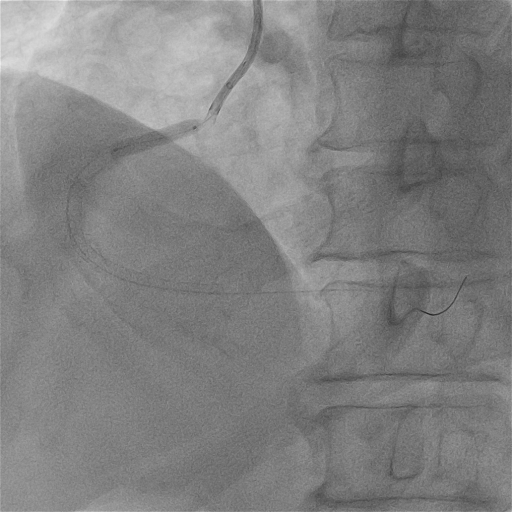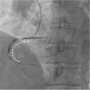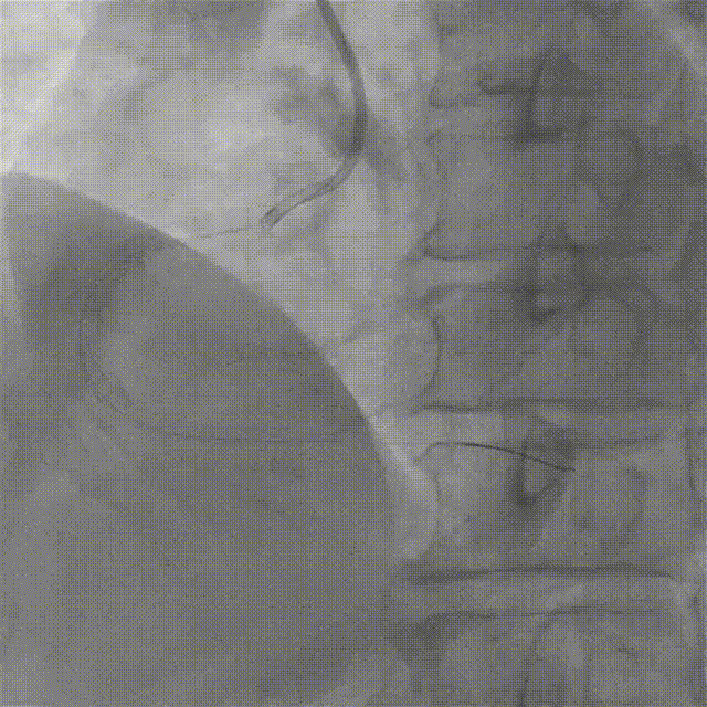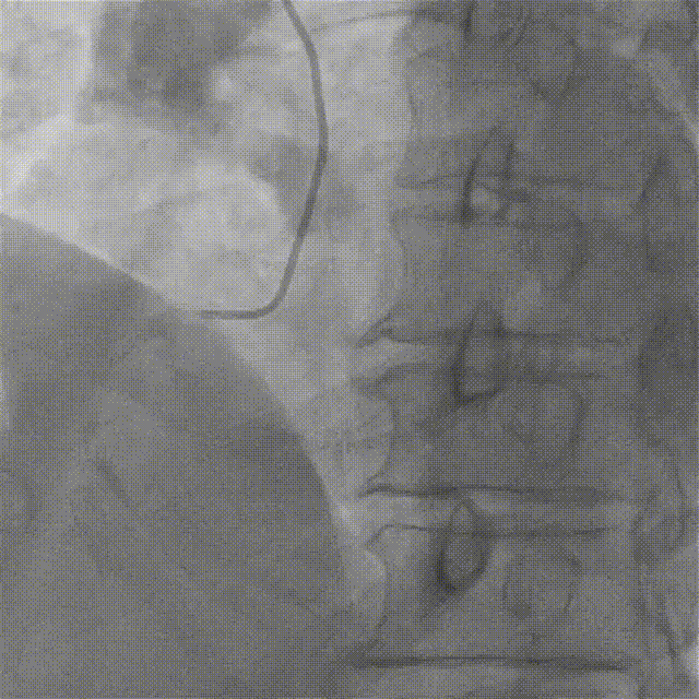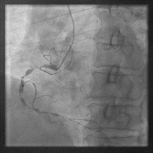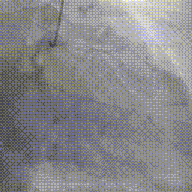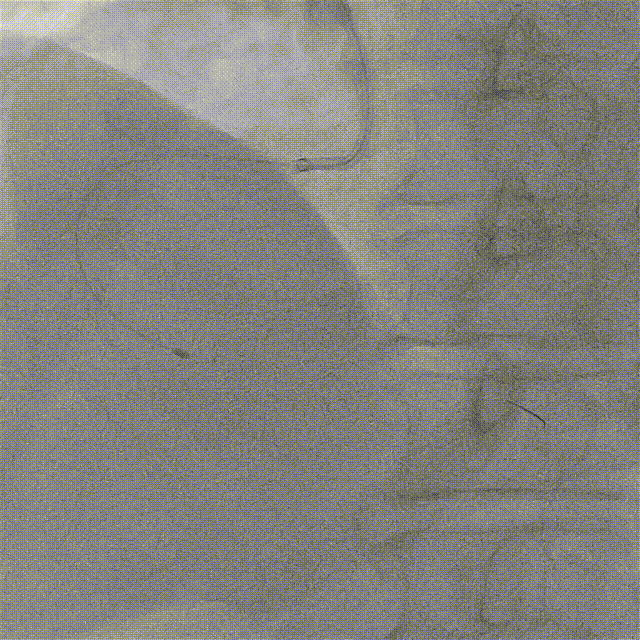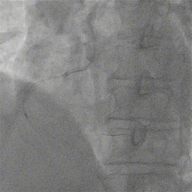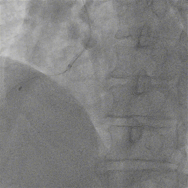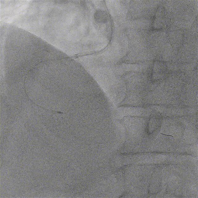 造影显示右冠全程弥漫多处95%以上狭窄伴重度钙化,最重处次全闭塞,CTO导丝通过病变后,球囊及ELCA导管均无法通过,未能完成PCI治疗。