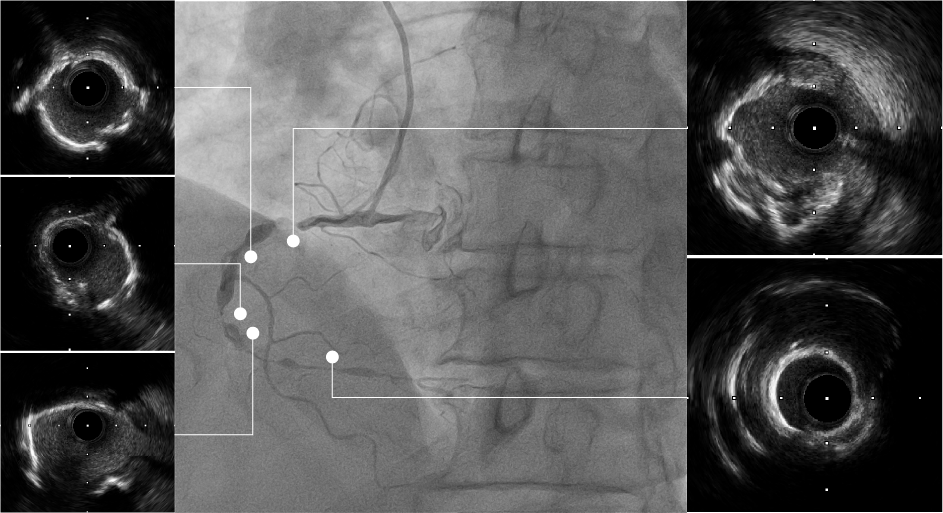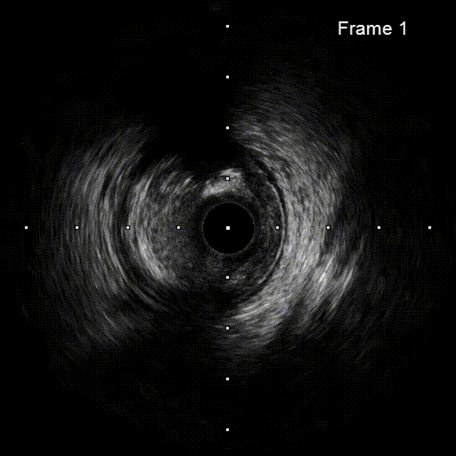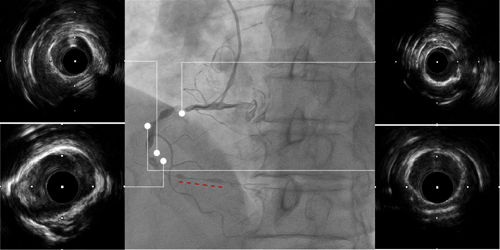 IVUS可见RCA近中段弥漫钙化病变,多>270°钙化环,3# 近端钙化壁较厚,可见旋磨后多重反射影;近中段病变扩张不充分,钙化环未见明显断裂,IVUS导管未能通过远端病变处。