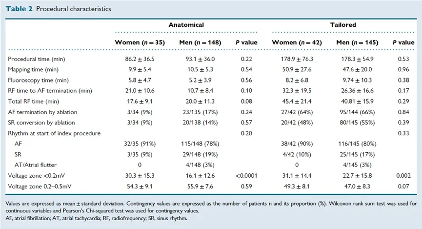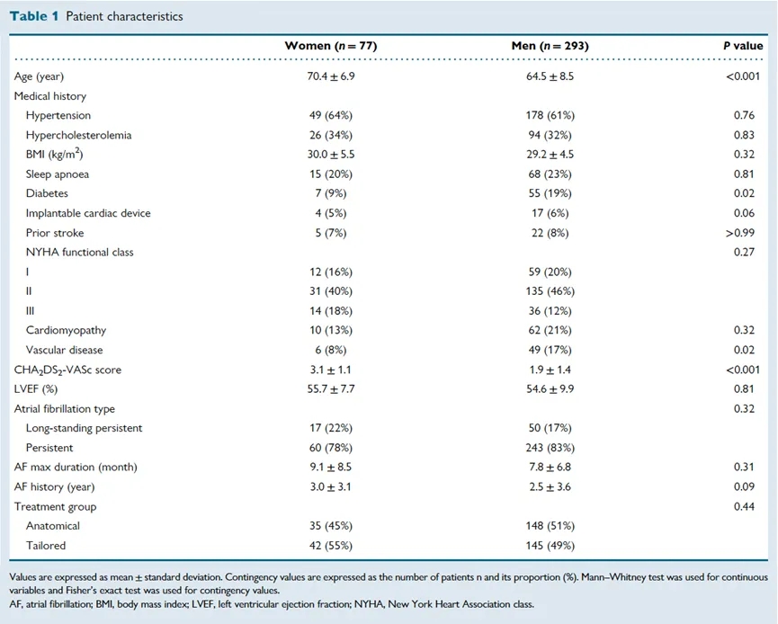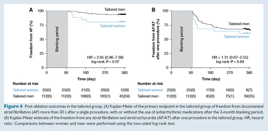 TAILORED-AF是一项多中心、随机、对照、双盲的优效性临床试验,旨在评估一种结合AI检测的个体化消融策略对于持续性房颤患者的疗效。该策略在标准PVI的基础上,联合AI识别的时空离散度区域消融,并与单纯PVI进行对比。该研究共纳入了来自欧洲和美国26个中心的年龄≥18岁、对至少一种抗心律失常药物无效的症状性持续性或长程持续性房颤患者,且所有患者均适合接受首次消融治疗。参与者按1:1的比例被随机分配至对照组(仅接受PVI)或个体化消融组(接受PVI联合AI引导的时空离散度区域消融)。本研究是基于TAILORED-AF试验数据的亚组分析,旨在比较男性和女性患者在上述两种不同消融策略下的治疗效果差异。