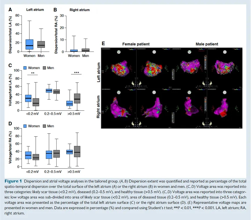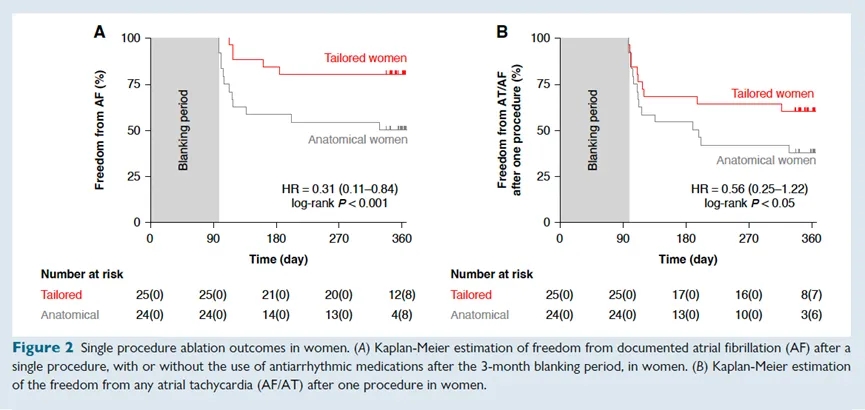 尽管如此,关于单纯肺静脉隔离(PVI)术后女性是否确实具有更高的心律失常复发风险,目前的临床数据结论并不一致。尽管临床上已尝试采用标准化的肺静脉外消融策略,但其相较于单纯PVI并未显示出明确优势,其他消融方法能否为女性患者带来特别获益,目前也尚无定论。近期发表的随机对照临床试验TAILORED-AF表明,采用人工智能(AI)检测时空离散度并结合PVI的个体化导管消融策略,与单纯PVI相比,可显著降低房颤复发率。AI引导的时空离散度检测能够可靠且可重复地识别出维持房颤的关键基质,这可能是该个体化策略取得成功的重要原因。另外,研究显示,时空离散度具有具有患者特异性,这也为消融方案的个体化定制提供了有力依据。基于TAILORED-AF试验的数据,近期发表于《EUROPACE》的一项研究进一步探讨了这种AI引导的个体化导管消融策略是否对持续性房颤女性患者具有特别的临床益处。