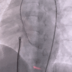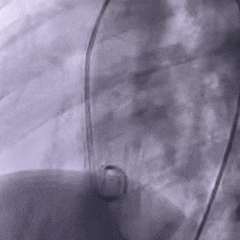 DSA下推出右盘,由于缺损隧道较长,为防止右盘展开后被牵拉入隧道内,术中全程保持钢缆张力使左盘稳定贴靠室间隔,再后撤鞘管展开右盘