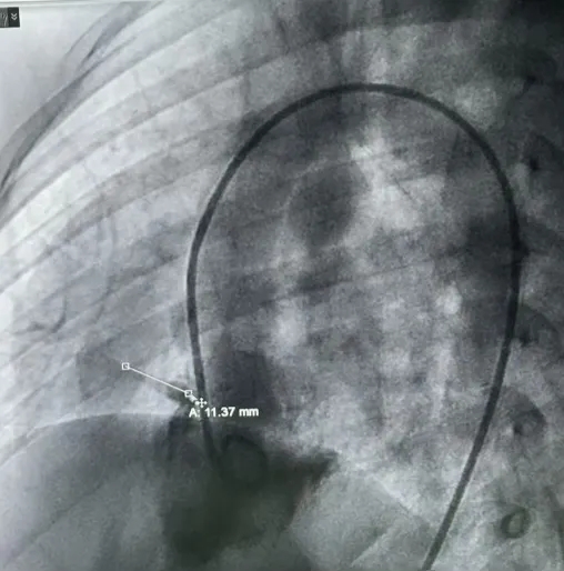 术中造影复测缺损左室面破口3.9mm,隧道长11.37mm,判定为长隧道型室间隔缺损。
