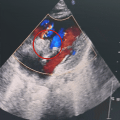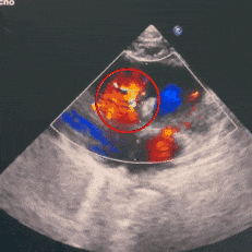 术前超声描述:心脏位置及连接正常。左房稍大,左室稍增大,左室壁收缩活动可。室间隔缺损7.1mm(膜周流入道+小梁),部分假性膜部瘤形成,左室面分流口3.5mm,右室面分流较弥散,主要位于瘤体中部,左向右分流速4.92m/s,少量分流经三尖瓣入右房,束宽约1.6mm。