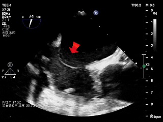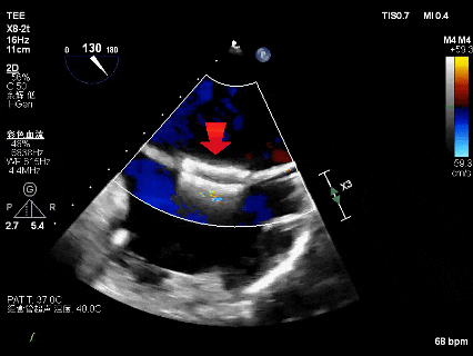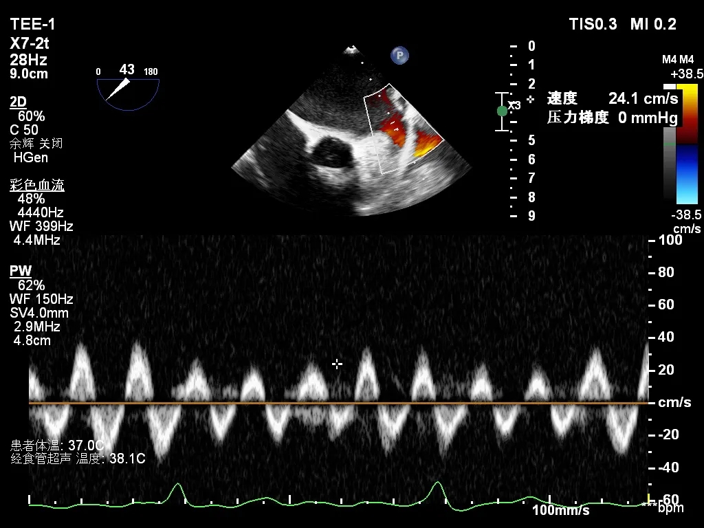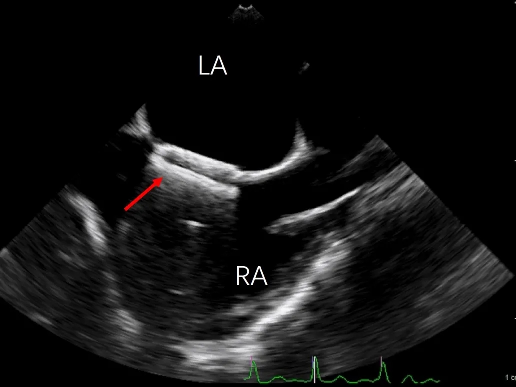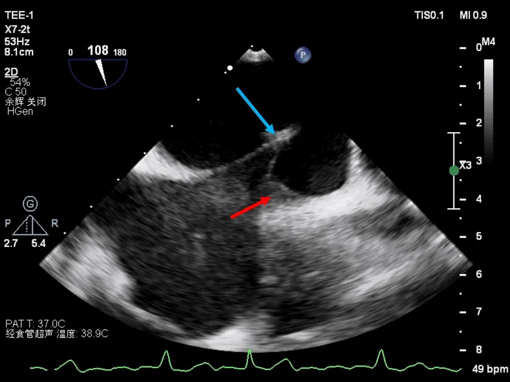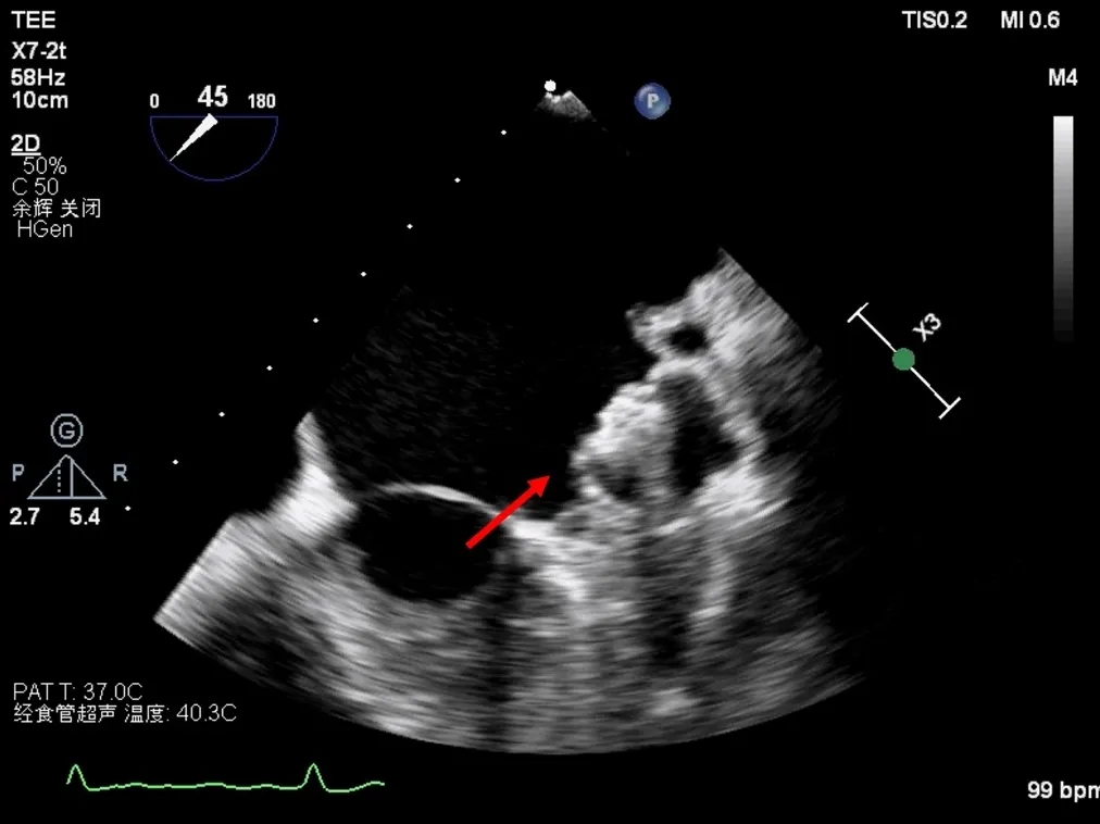 常规经食道超声心动图(TEE)评估发现,左心耳血流速度明显减慢,流速约 24 cm/s,提示存在血栓形成高风险因素,但左心耳内未见自发显影。此外,TEE发现巨大房间隔膨胀瘤(ASA,大小约28×10mm),同时合并卵圆孔未闭(PFO),且ASA腔内可见明显自发性显影(SEC),其内血流速率明显减慢(20.8cm/s)。