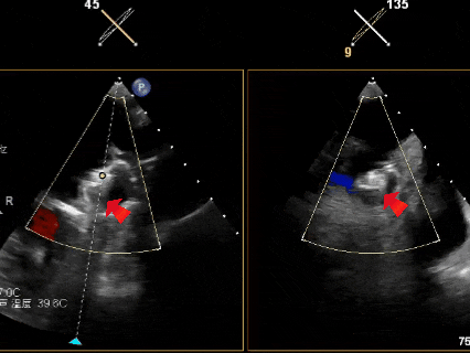 选择27mm Watchman FLX(Boston Scientific)左心耳封堵器,置入顺利,位置良好,压缩比合适,无残余漏,牵拉试验稳定。完成后交换输送鞘,选择D‐Shufo(Vickor)卵圆孔封堵器(30mm),完全覆盖ASA与PFO,TEE无残余分流。