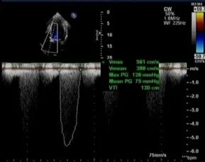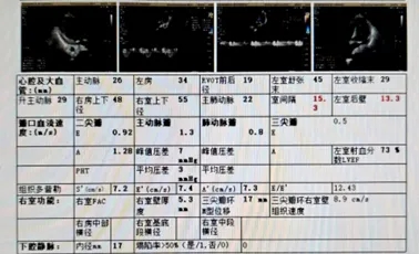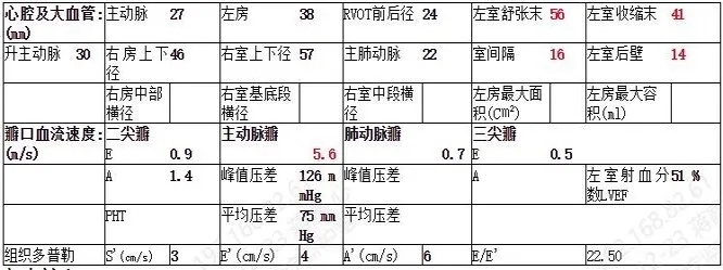 超声心动图:主动脉瓣环内径20mm,瓣口峰值流速5.6m/s,主动脉瓣峰值跨瓣压差126mmHg,平均跨瓣压差75mmHg,开放受限,关闭欠佳;主动脉瓣反流,彩束面积4.3cm2。
