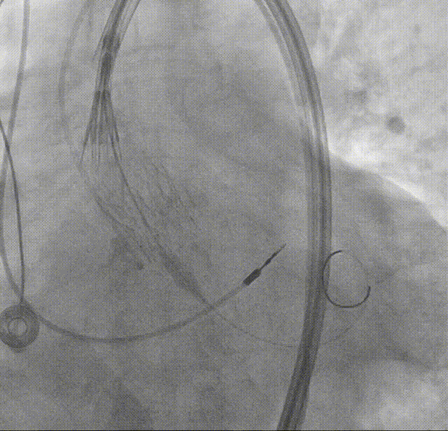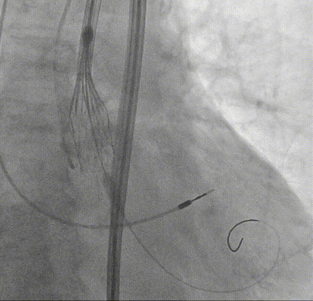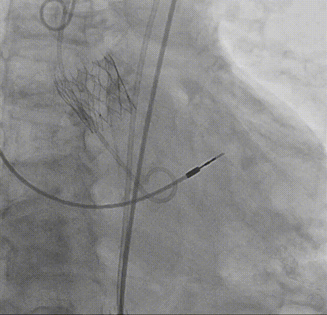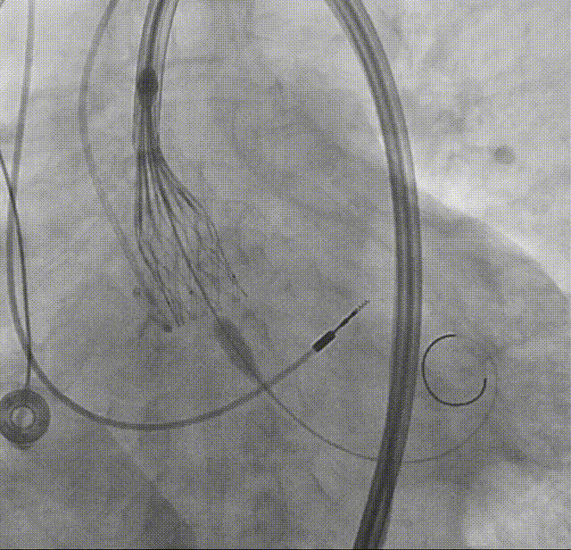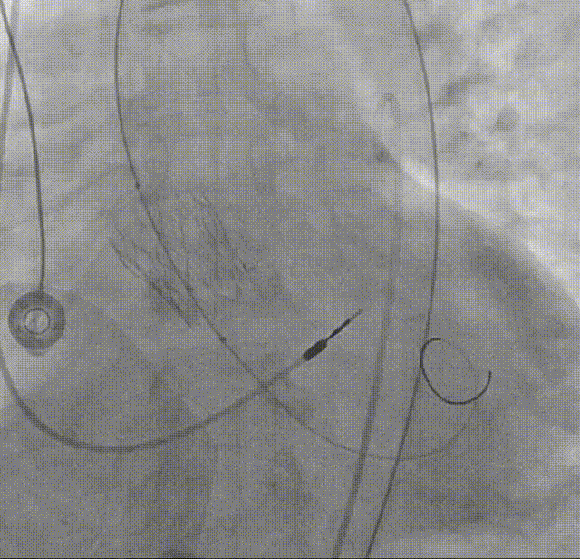 考虑瓣膜形态与位置均可,备球囊后扩处理方案,决定进行瓣膜脱钩,可见瓣膜脱钩稳定无位移