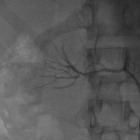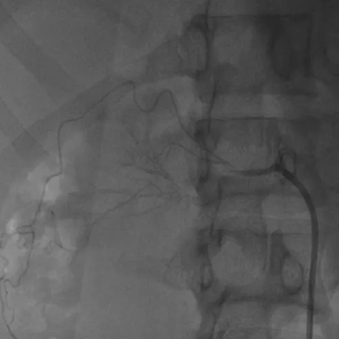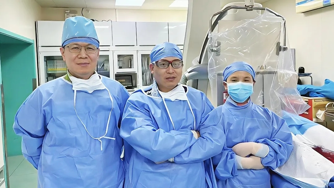 经过周密评估,团队制定了精细的介入手术方案,并特邀北京专家指导,由济南市中心医院高血压科介入团队关玉庆、孔庆赞、刘淼主任共同施术。术中造影证实了术前判断:右肾动脉中远段血栓形成、血管近乎闭塞。在精准操作下,导丝顺利通过闭塞段,经球囊扩张后,血流恢复通畅。