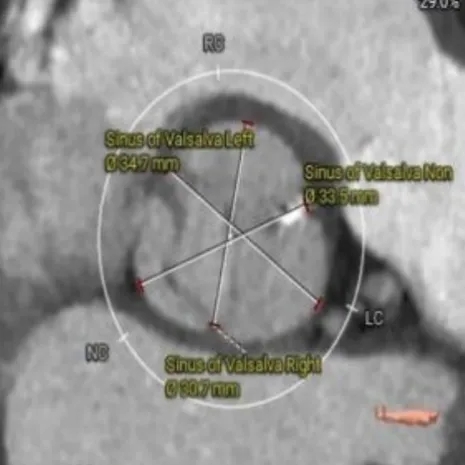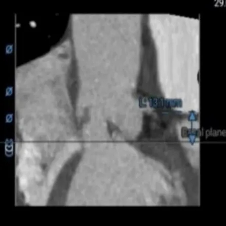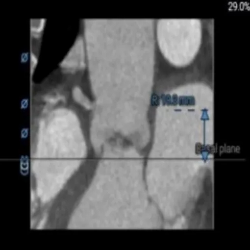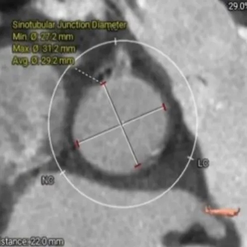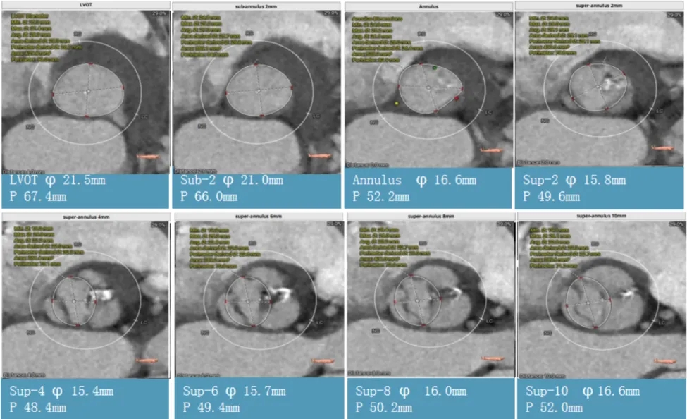 术前CT评估:功能性二叶瓣,左右融合嵴伴钙化,瓣叶增厚,瓣环径26.5,LVOT:28.7,瓣上可打开至23左右,窦部空间可,双侧冠脉开口高度可,主动脉弓大弯侧无明显钙化,双侧髂股动脉内径偏细,右侧股动脉分叉位于股骨头平面中部,左侧股动脉分叉位于股骨头平面中下1/3,建议右侧股动脉入路。