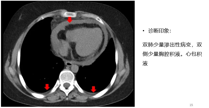29岁青年女性,慢性病程急性发作,以间断发热、胸痛为主。查体,体温升高,最高38℃,心动过速,没有心包摩擦音,心音低钝,心电图提示广泛导联ST-T段改变。心脏超声提示少到中量心包积液及渗出。肺CT提示心包积液,心包增厚。根据指南,心包炎诊断需满足以下4条中的任意2条:胸痛、心包摩擦音、心电图改变、心包积液。结合患者的症状、体征及辅助检查,心包炎诊断成立,排除冠心病、胸膜炎、易栓症诊断。