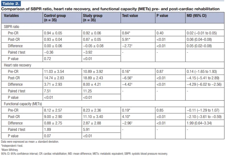 研究结果显示,三个月后,SBPR 仅在心脏康复组有显著改善,由 0.92±0.06 降至 0.87±0.05(P<0.01),而在对照组无明显变化。两组 HRR 均有所提升,但心脏康复组改善幅度更大;同时,康复组 METs 显著提高,提示整体功能恢复与血流动力学改善同步发生。
