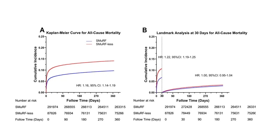 结果显示,23.1%的STEMI患者在发病前无任何SMuRF。此类患者通常年龄更大、女性比例略高,入院时心功能更差,接受GDMT和直接PCI的比例也更低。两组预后差异显著:在发病后30天内,SMuRF-less患者的死亡率更高(10.7% vs. 6.7%),死亡风险较SMuRF患者高出22%(HR: 1.22, 95% CI: 1.19–1.25);然而,在第31天至1年的随访期内,两组死亡率趋于一致(3.8% vs. 3.2%,HR: 1.00, 95% CI: 0.95–1.04)。(图1)
