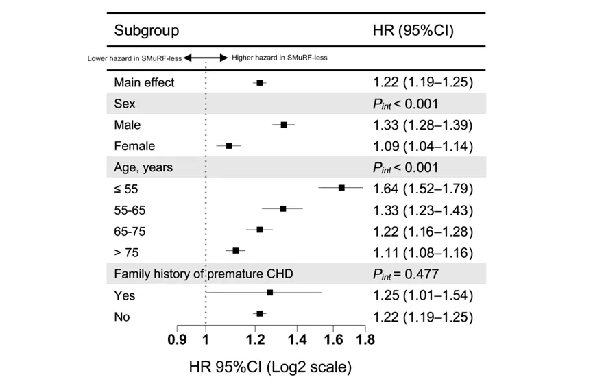 亚组分析发现,仅在年龄和性别方面观察到与30天死亡率的交互作用。在0–30天随访期内,尽管死亡率随年龄增长而上升,但SMuRF-less对死亡率的负面影响逐渐减弱(交互P<0.001);至31–365天随访期,两组间死亡率差异消失。在有早发冠心病家族史的患者中,无论随访时间长短,均未观察到SMuRF-less状态与全因死亡之间的关联。(图2)