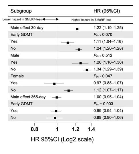 图4. 两组患者之间主要结局风险比(0-30天与31-365天)的亚组分析(早期GDMT)