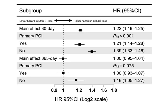 在治疗反应方面,男性中无论是否接受早期GDMT,SMuRF-less状态均持续增加0–30天死亡风险。然而在女性中,早期GDMT完全消除了SMuRF-less相关的死亡风险升高(早期GDMT: HR 0.97, 95% CI 0.88–1.07;非早期GDMT: HR 1.12, 95% CI 1.07–1.17;交互P=0.047)。(图4)。此外,直接PCI显著改变了长期预后:虽然无论是否接受PCI,SMuRF-less患者的0–30天死亡率均较高,但接受PCI的患者在1年时死亡率无差异(HR 1.00, 95% CI 0.93–1.07),而未接受PCI的患者仍保持较高死亡风险(HR 1.16, 95% CI 1.05–1.27)。(图5)
