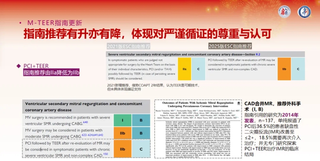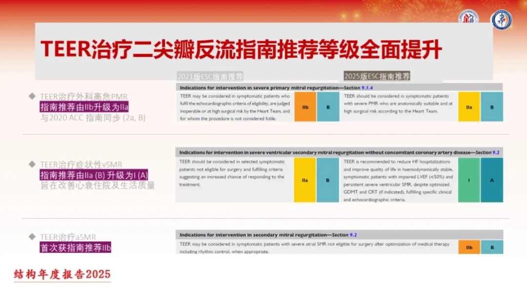 2025年全球TEER植入例数60,000例,共累计植入316,088例。随着循证医学数据累积,2025年ESC M-TEER指南推荐内容发生更新,TEER治疗外科高危PMR的推荐等级由Ⅱb升级为Ⅱa,TEER治疗症状性vSMR的推荐等级由Ⅱa(B)升级为Ⅰ(A),TEER治疗aSMR首次获得Ⅱb推荐,但是PCI+TEER的推荐等级由Ⅱa降至Ⅱb,且推荐CAD合并MR患者接受外科手术(Ⅰ,B)。
