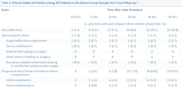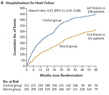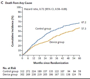 COAPT RCT研究将614名患者按1:1比例随机分配为MitraClip G1+GDMT组(器械组)和GDMT组(对照组),随访5年结果显示,器械相关安全事件发生率仅1.4%(4/293)且全部发生于术后30天内,器械组年化心衰住院率显著降低(33.1% vs 57.2%, HR 0.53),全因死亡率亦显著降低(57.3% vs 67.2%, HR 0.72),心衰住院与全因死亡复合终点显著降低(73.6% vs 91.5%, HR 0.53)。